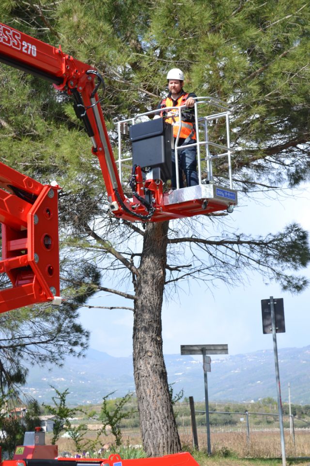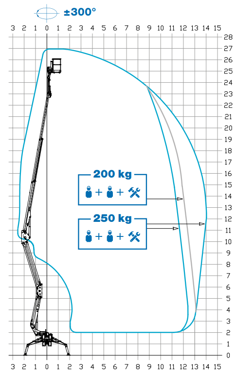 Radna visina 27 m; bočni dohvat 14 m; nosivost korpe 250 kg