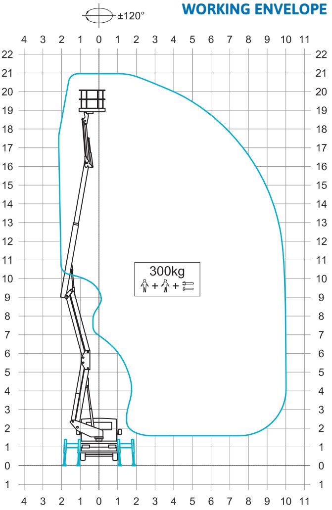 Radna visina 21 m; bočni dohvat 10 m; nosivost korpe 300 kg. nadogradnja sa JIB-om