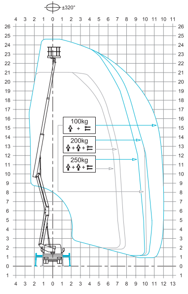 Radna visina 24,6 m; bočni dohvat 12 m; nosivost korpe 250 kg; S3 Smart Stability System